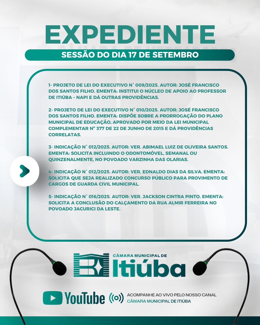 Acompanhe de forma presencial ou pelo Instagram e o canal do YouTube: Câmara Municipal de Itiúba.