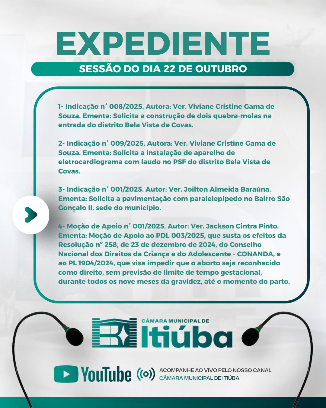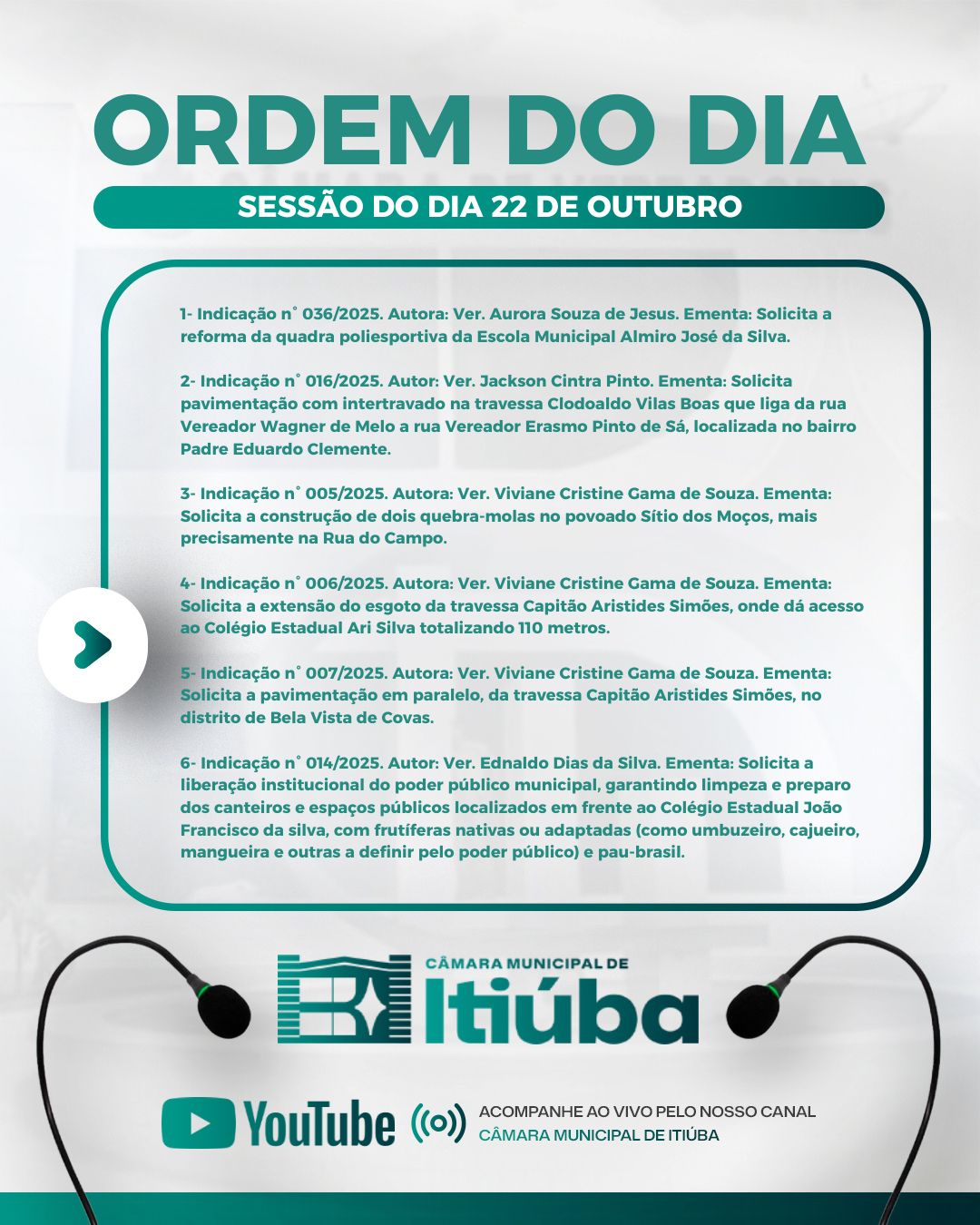 Acompanhe de forma presencial ou pelo Instagram e o canal do YouTube: Câmara Municipal de Itiúba.