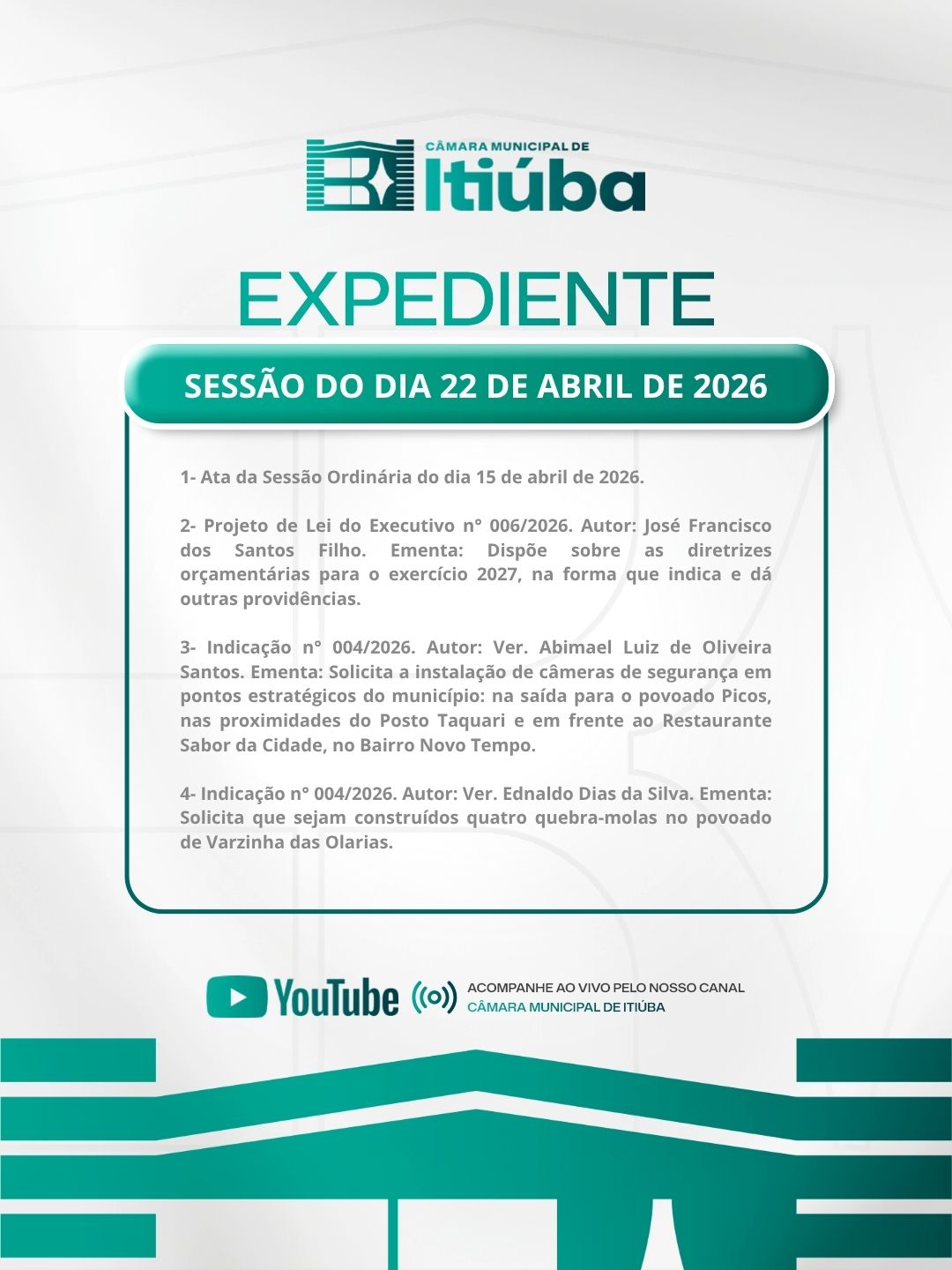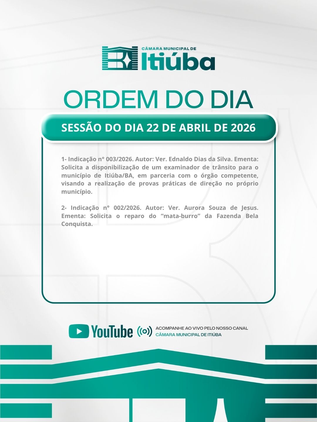 Participe presencialmente ou acompanhe ao vivo pelas redes sociais oficiais da Câmara Municipal de Itiúba no Instagram e no YouTube. Sua presença faz a diferença!