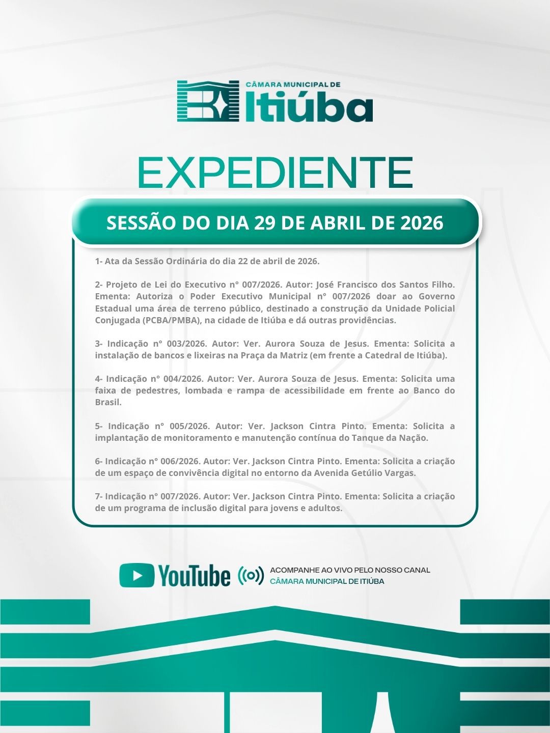 Participe presencialmente ou acompanhe ao vivo pelas redes sociais oficiais da Câmara Municipal de Itiúba no Instagram e no YouTube. Sua presença faz a diferença!
