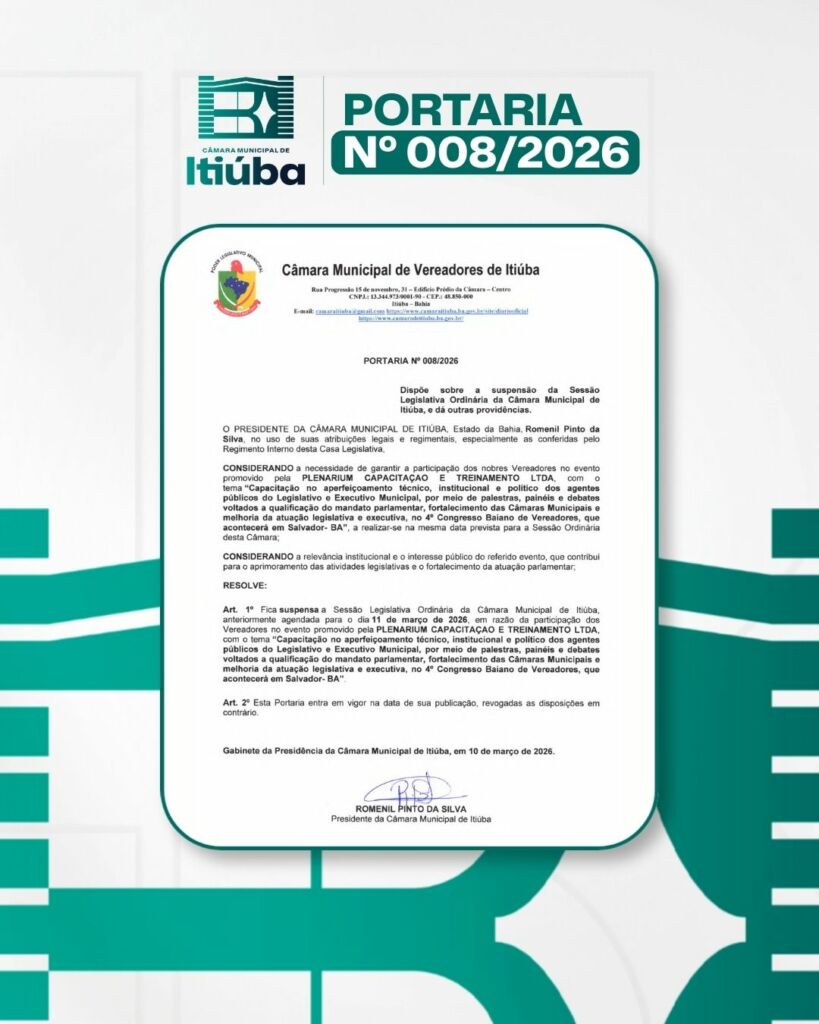 A Câmara Municipal de Itiúba informa que, por meio da Portaria nº 008/2026, a Sessão Legislativa Ordinária que estava prevista para o dia 11 de março foi suspensa.